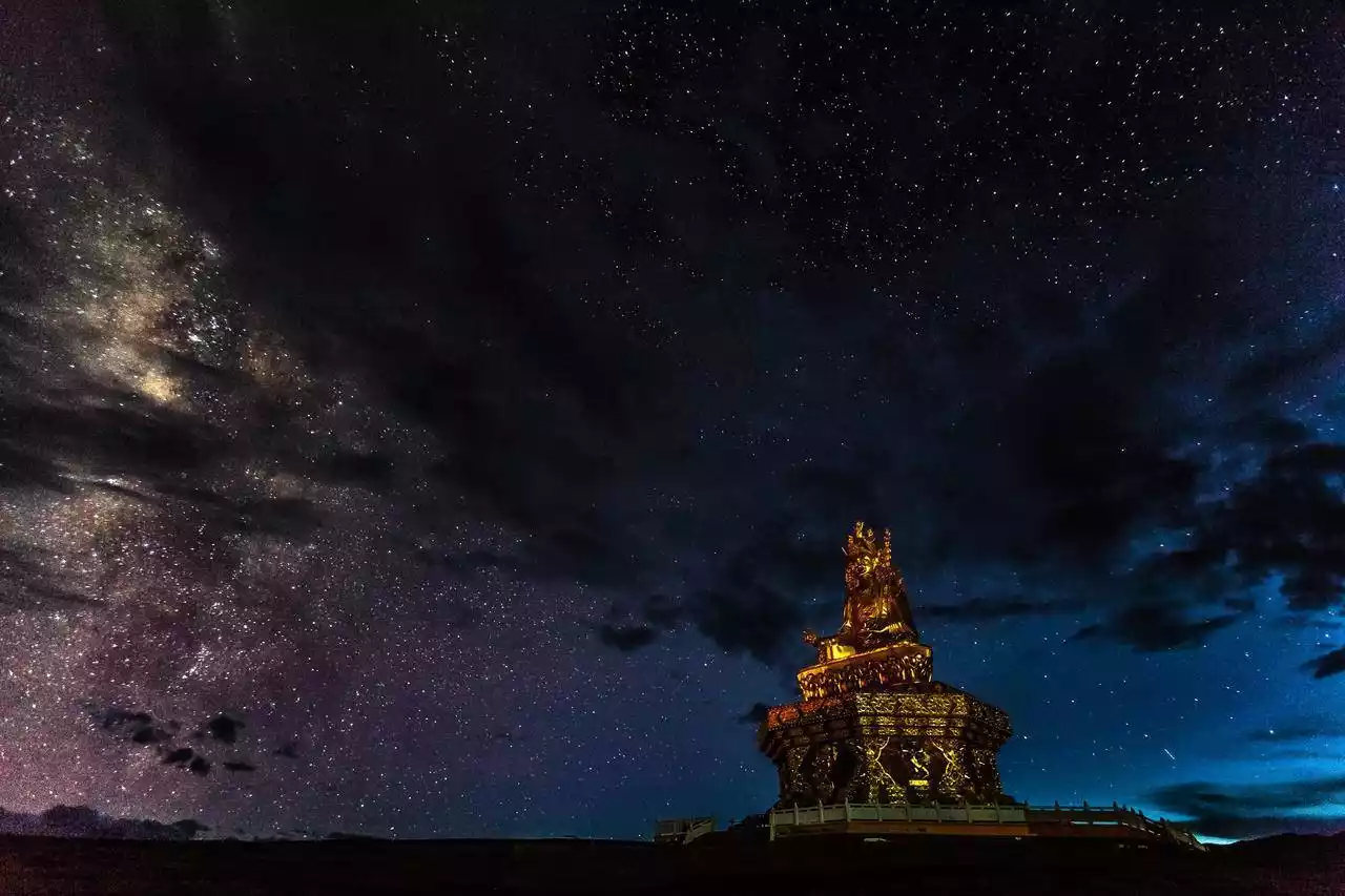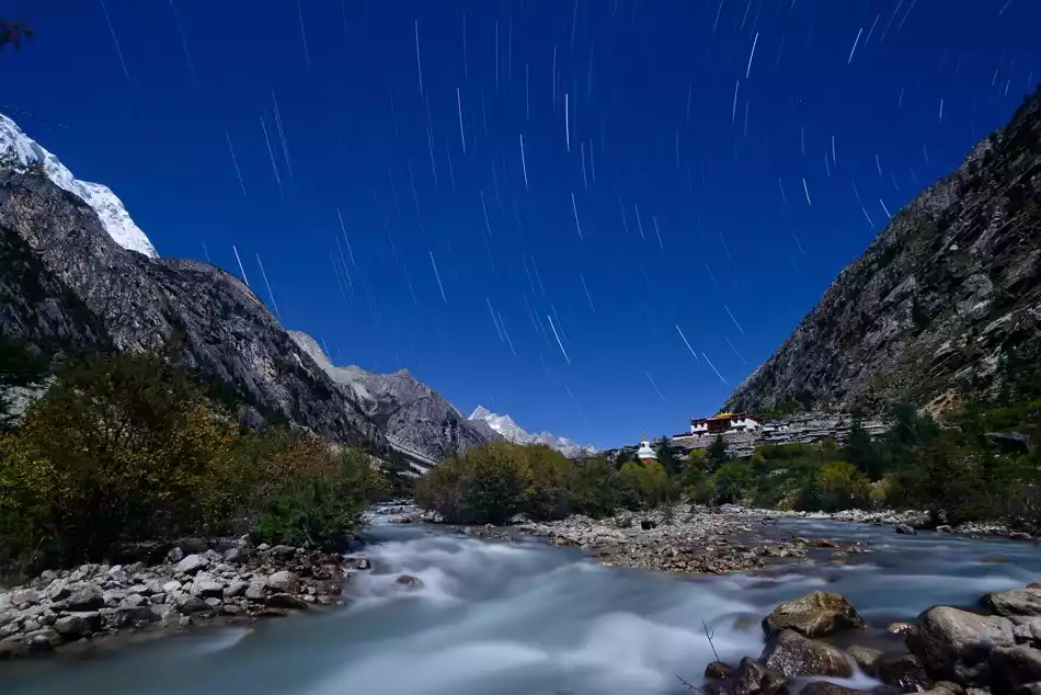 Beneath the starry sky, the water gurgles; the white pagoda and golden roof of Lenggu Temple stand silently in the night sky; behind the temple, the towering Genyen Mountains reach into the clouds. Everything around is illuminated by the starlight, as if it were daytime. Under the deep blue sky, echoes of ancient times seem to echo. The world spins imperceptibly, the stars stretched into lines, then woven into a web, finally encompassing all things on earth, the Milky Way, and the Milky Way.