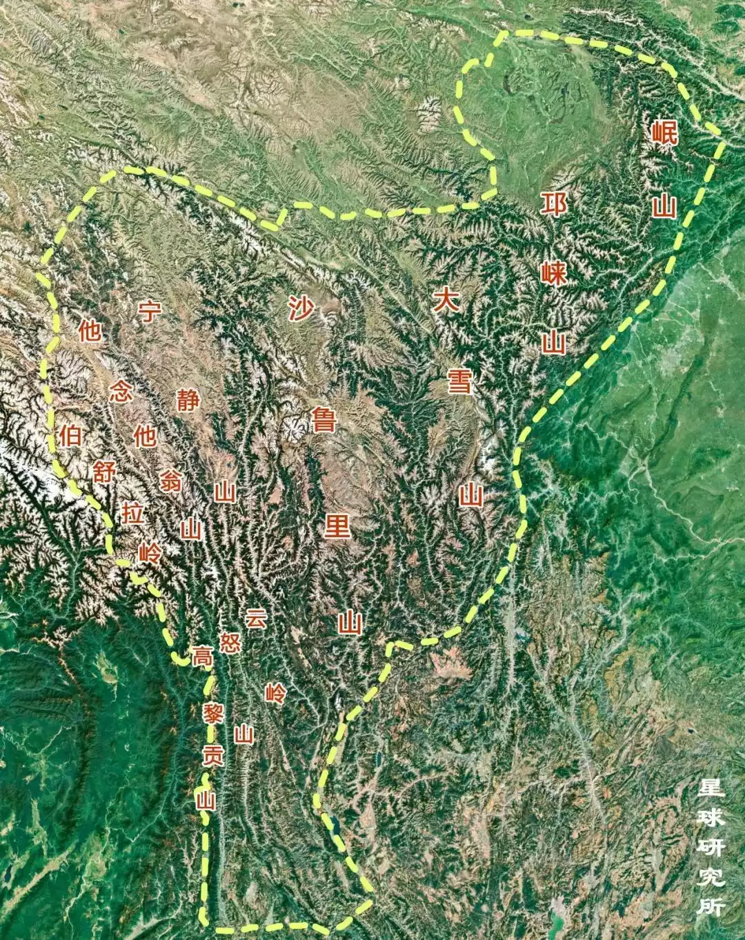 Schematic diagram of the location of Mount Shaluli. The yellow line on the way is the Shaluli Mountains. Image from the Institute of Planetary Research
