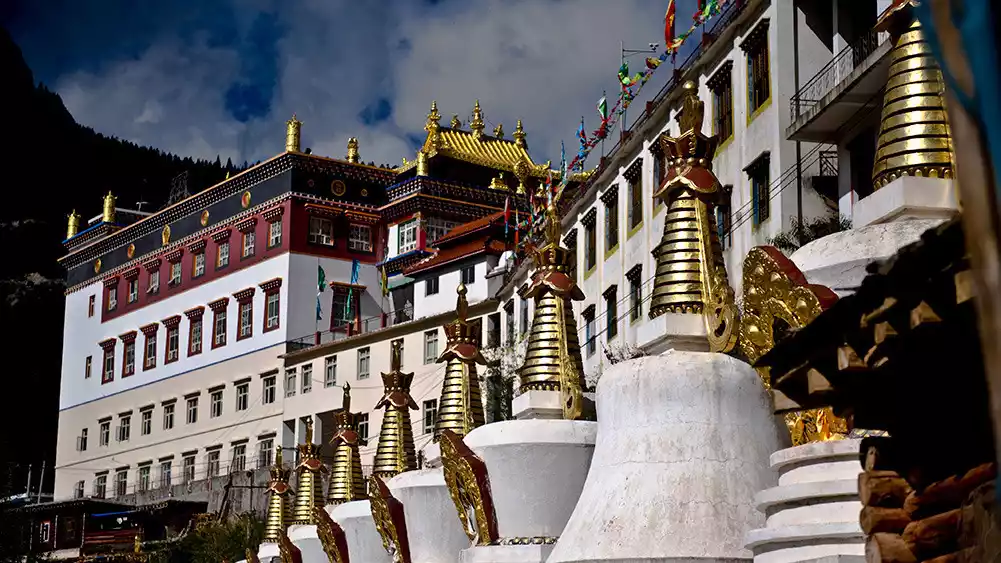 At the end of the Southern Song Dynasty, the first Karmapa, Dusum Khyenpa, founded Lenggu Monastery at the foot of Mount Genyen, becoming one of the birthplaces of the Karma Kagyu sect of Tibetan Buddhism. This secret place can only be encountered by crossing high mountains and deep valleys.