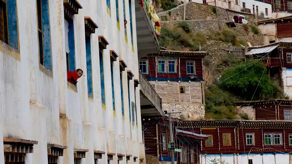 The monks at Baiyu Temple are very friendly. They exchange a greeting of "Tashi Delek" as they pass by, earning a knowing smile. A large open area in front of the temple's main hall is used for both grand ceremonies and more regular debates, the only way for monks to verify their knowledge. The main hall was damaged during the decade of unrest and has been restored in recent years. Three statues of Sakyamuni, Guru Padmasambhava, and the Four-Armed Avalokitesvara are enshrined in the center of the hall. Behind them are densely packed ceiling-high volumes of Buddhist scriptures. Despite their numerous contents, they are remarkably well-preserved, spotless. Like most temples in Tibet, the monks' quarters and other buildings are arranged around a few main halls, not strictly adhering to a symmetrical or central axis.
