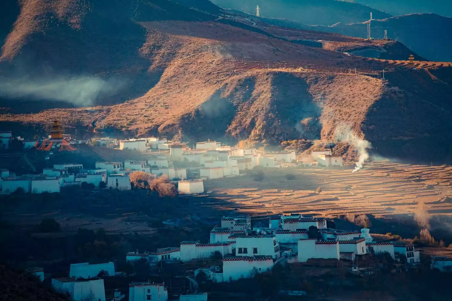 This is a small county town nestled in the heart of the Shaluli Mountains. Perched against a rocky peak, a temple completely dominates the mountain, its Buddhist halls and monks' huts stacked one after another, its scale breathtaking. Baiyu Temple occupies almost half of the county town. Its white walls, golden roof, and geraniums dazzle under the highland sun. The temple stands tall on the mountaintop, overlooking the Jinsha River, a river cascading down from the sky; it overlooks the devout people reincarnating in the worldly world, and the county town beneath it, which has undergone centuries of ups and downs.