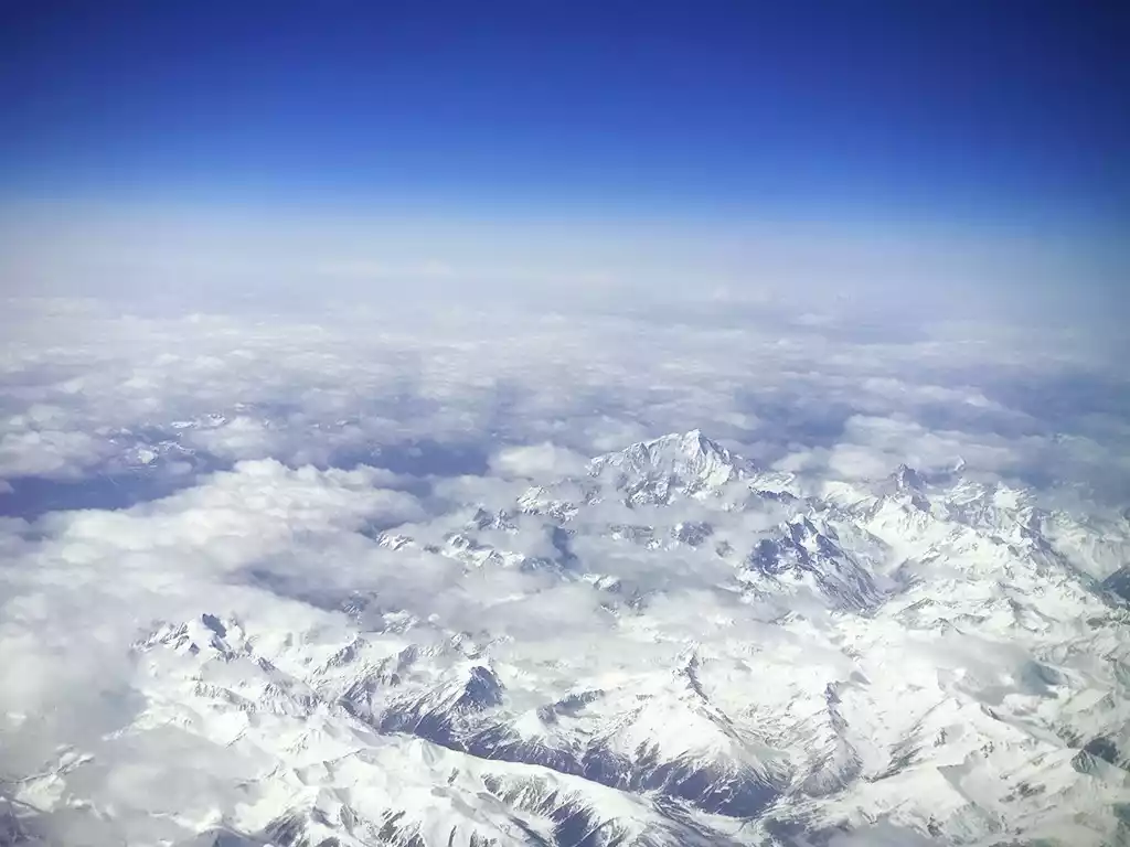 Looking at the Shaluli Mountains from the plane, the peak in the middle is the sacred mountain Genyen, and the three sacred mountains of Aden are faintly visible in the distance.