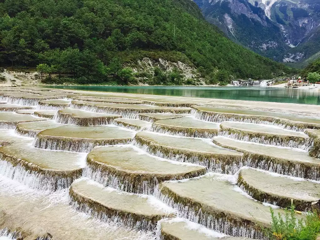 Baishuitai, located at an altitude of 2,380 meters on the eastern slopes of Haba Snow Mountain, is the birthplace of the Dongba religion of the Naxi people. From a distance, nestled among the green mountains, Baishuitai resembles terraced fields. In the sunlight, it resembles a frozen waterfall in a photograph. Stepping onto the white stone steps brings an indescribable coolness and refreshing sensation. Baishuitai was formed by calcium carbonate dissolving in spring water. As the spring water, containing calcium bicarbonate, slowly flows down, the carbonates gradually precipitate, forming the terraced surface over the years. Due to its terraced appearance, it is known as the "Immortal's Relics." Covering approximately three square kilometers, it is the largest Huaquan Terrace in my country.