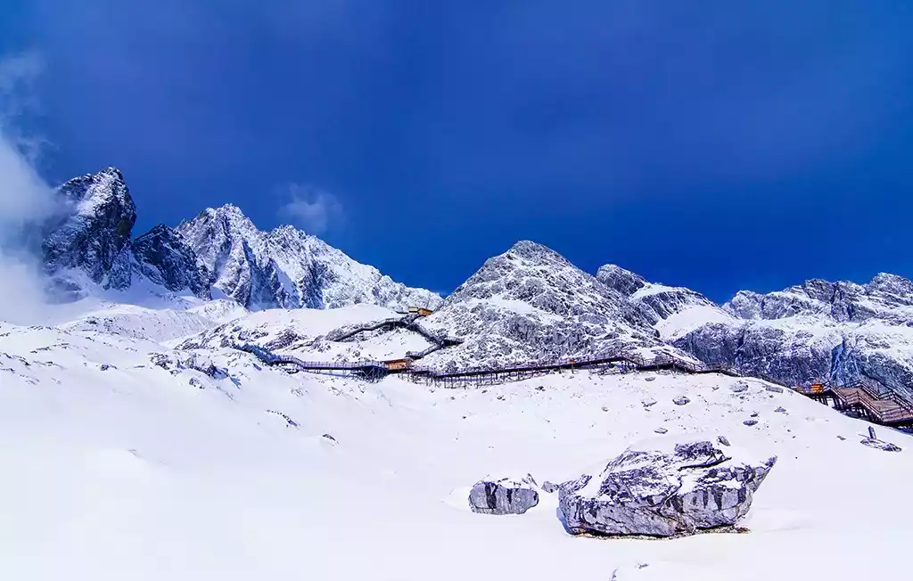 The thirteen snow-capped peaks stretch endlessly like a giant dragon soaring and dancing, hence the name "Jade Dragon" by the local Han people. Because the mountain is primarily composed of limestone and basalt, with distinct black and white, it is also known as the "Black and White Snow Mountain," a sacred mountain for the Naxi people.