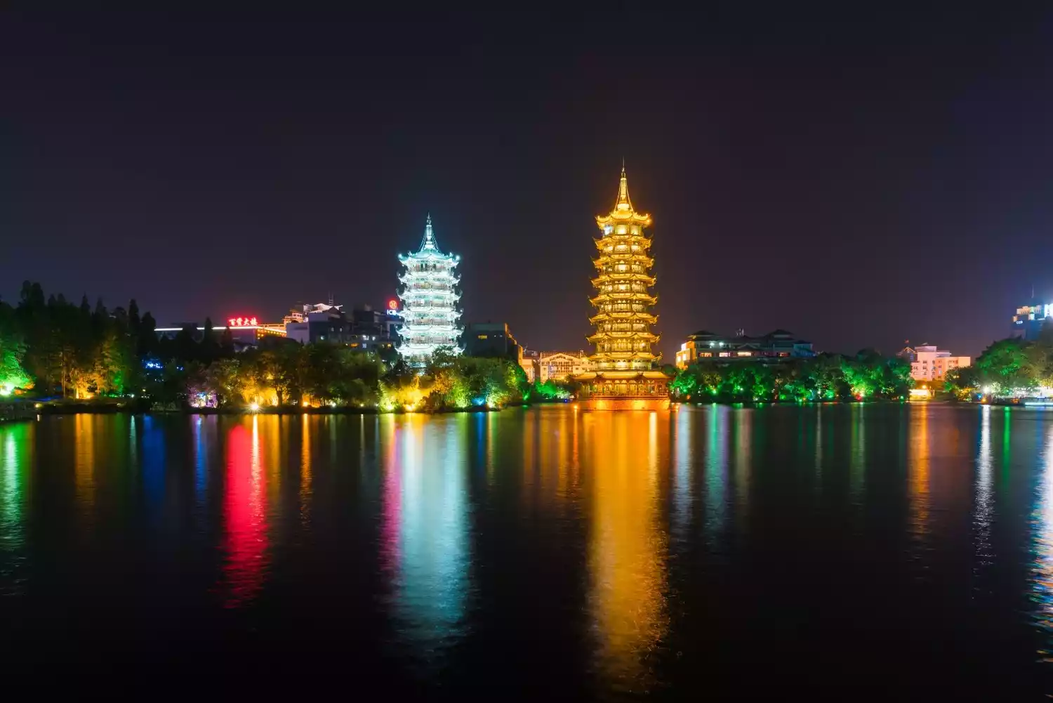 Thousands of peaks rise in the wilderness, embraced by a river. The interconnected waterways of two rivers and four lakes create the most picturesque scenery around Guilin's city center. Many people choose to take a boat tour from the pier to enjoy the scenery, but boat rides are crowded, noisy, and inevitably expensive. A better option is to stroll along the riverside trail, listening to the sounds and enjoying the scenery. If it rains, you can even experience the gentle, hazy beauty of misty Guilin. Of course, the best time to visit this area is at night, when the pavilions, bridges, twin towers, and the lake complement each other beautifully.