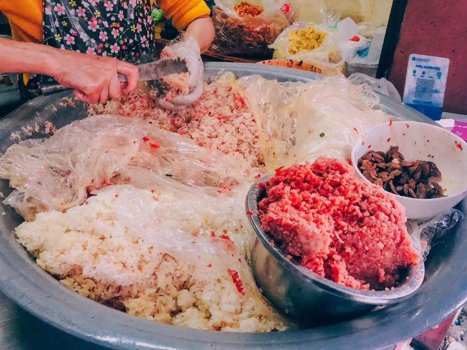 Guilin residents love glutinous rice, and it's a staple in their lives. Hot glutinous rice, topped with mung bean paste, pickled bamboo shoots, pickled beans, crispy spring rolls, and braised pork, all drizzled with brine and chili sauce—you can only find it in Guilin!