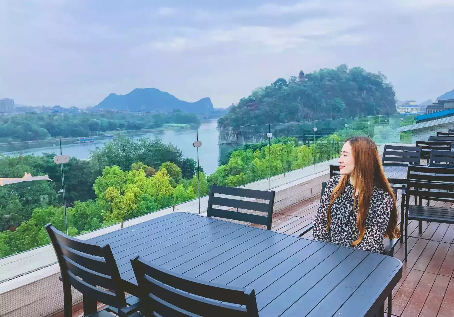 Elephant Trunk Hill, named for its resemblance to a giant elephant drawing water from the river, is Guilin's emblem, making it a must-see. However, due to its popularity as an online photo-op, it attracts a lot of visitors, and the entrance fee is 80 yuan. Therefore, a different approach to the experience can greatly enhance your visit! Just across the river, there's a cafe where you can relax and enjoy a cup of tea while gazing out over the panoramic views of Elephant Trunk Hill and the Sun and Moon Pagodas. A completely different perspective offers a completely different sensory experience.