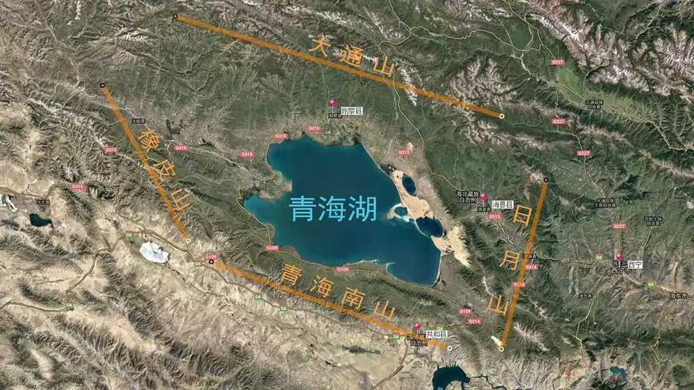 The entire Qinghai Lake is surrounded by towering mountains: Datong Mountain to the north, Riyue Mountain to the east, Qinghai Nanshan Mountain to the south, and Rubber Mountain to the west. The following map will intuitively show the location of Qinghai Lake.
