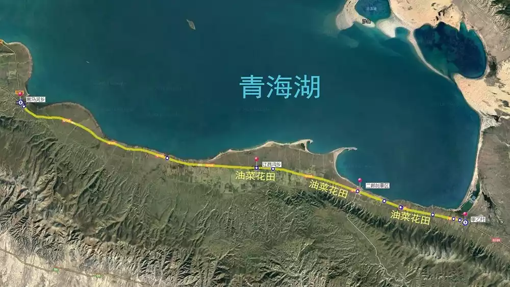 The southern route of Qinghai Lake runs from Jiayi Village in the east to Heimahe Township in the west, passing through rapeseed fields, the Erlangjian Scenic Area, and Jiangxigou Township. As the southern route is the most popular tourist area of Qinghai Lake, there are numerous hotels and restaurants to choose from, mostly concentrated around the Erlangjian Scenic Area. The southern route also features a dedicated bicycle greenway, perfect for experiential cycling, and most hotels offer bicycle rentals.