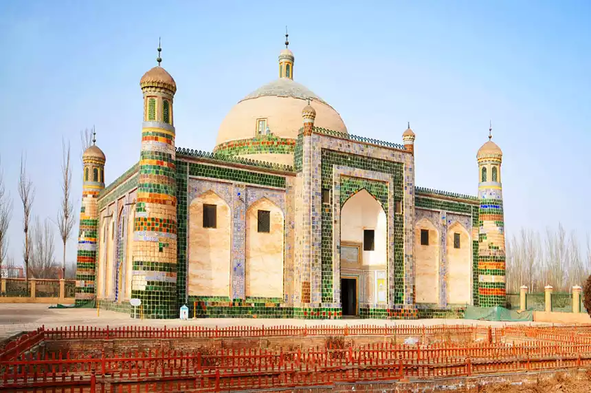 The Xiang Fei Tomb, built around 1640 AD, is a typical ancient Islamic architectural complex and the burial site of a descendant of the Islamic saint, covering two hectares. Resembling a magnificent palace, it comprises five sections: a gatehouse, a small mosque, a large mosque, a scripture hall, and the main burial chamber. Xiang Fei was the beloved consort of Emperor Qianlong of the Qing Dynasty. Her real name was Maimur Aizim. She had a unique fragrance from childhood and was nicknamed "Iparhan" ("Fragrant Girl" in Uyghur). She was chosen as a concubine by the Qing emperor and given the title "Fragrant Concubine." She died of illness due to difficulty adapting to the climate and environment of the capital.