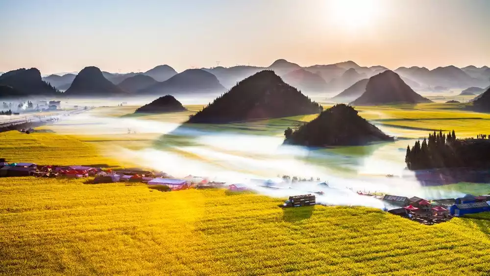 The hustle and bustle of the city has made us forget the comforts of our original rural life. Coming to Luoping, we experience that long-lost, beautiful life. At dawn, the sky is dimly lit. The sun slowly rises over the horizon, blowing away wisps of mist. The karst hills gradually become clear, and the rapeseed flowers, like newborn babies, unfold, filling the air with a faint, lingering golden fragrance. Poetry and the distant are so close.