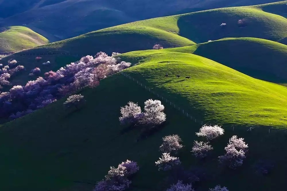 In April, the spring grass in the Ili River Valley grassland begins to grow, and the whole mountain is covered with lush green; on the green grassland, cattle, sheep and horses graze leisurely; on the grassland, thousands of wild apricot trees are in full bloom, covering the mountains and slopes, with branches and roots connected, pink twigs, fragrant breezes, and as bright as clouds; being in it is like walking on a mountain of flowers and a sea of flowers, as if entering a fairyland.