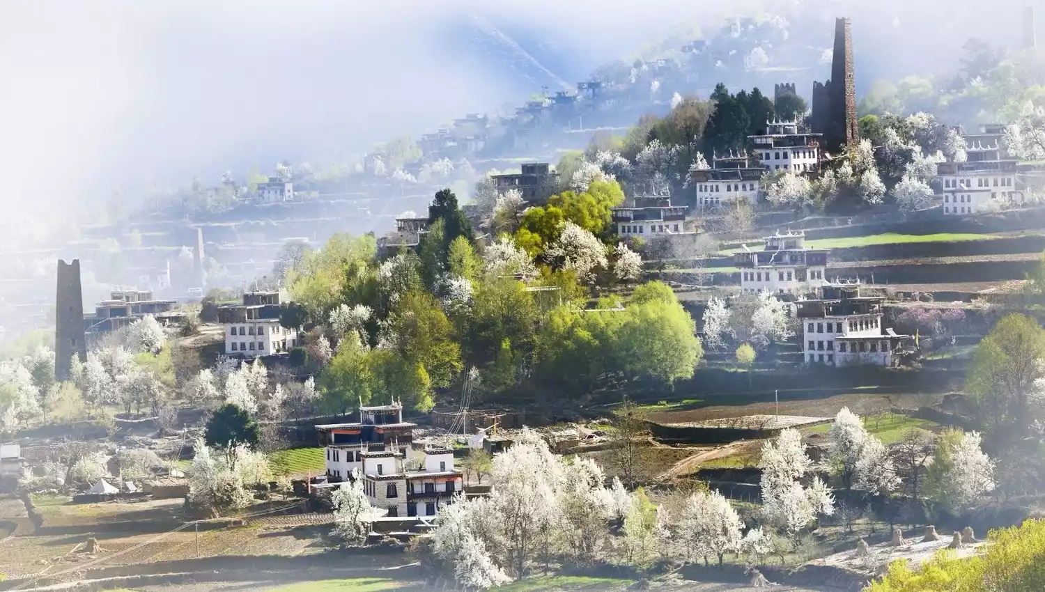 In mid-March, countless pear blossoms spread across Tibetan villages, river valleys, and mountains. The air is filled with a delicate fragrance, and as the wind blows, the petals dance in the air, dazzling the eyes. Tibetan villages and watchtowers, with their distinct Jiarong Tibetan architectural style, are nestled among the blossoms. Colorful prayer flags flutter from the elegant houses. In the distance, the blue sky stretches across the plateau, and snow-capped mountains stretch out in unison. Danba is at its most picturesque.