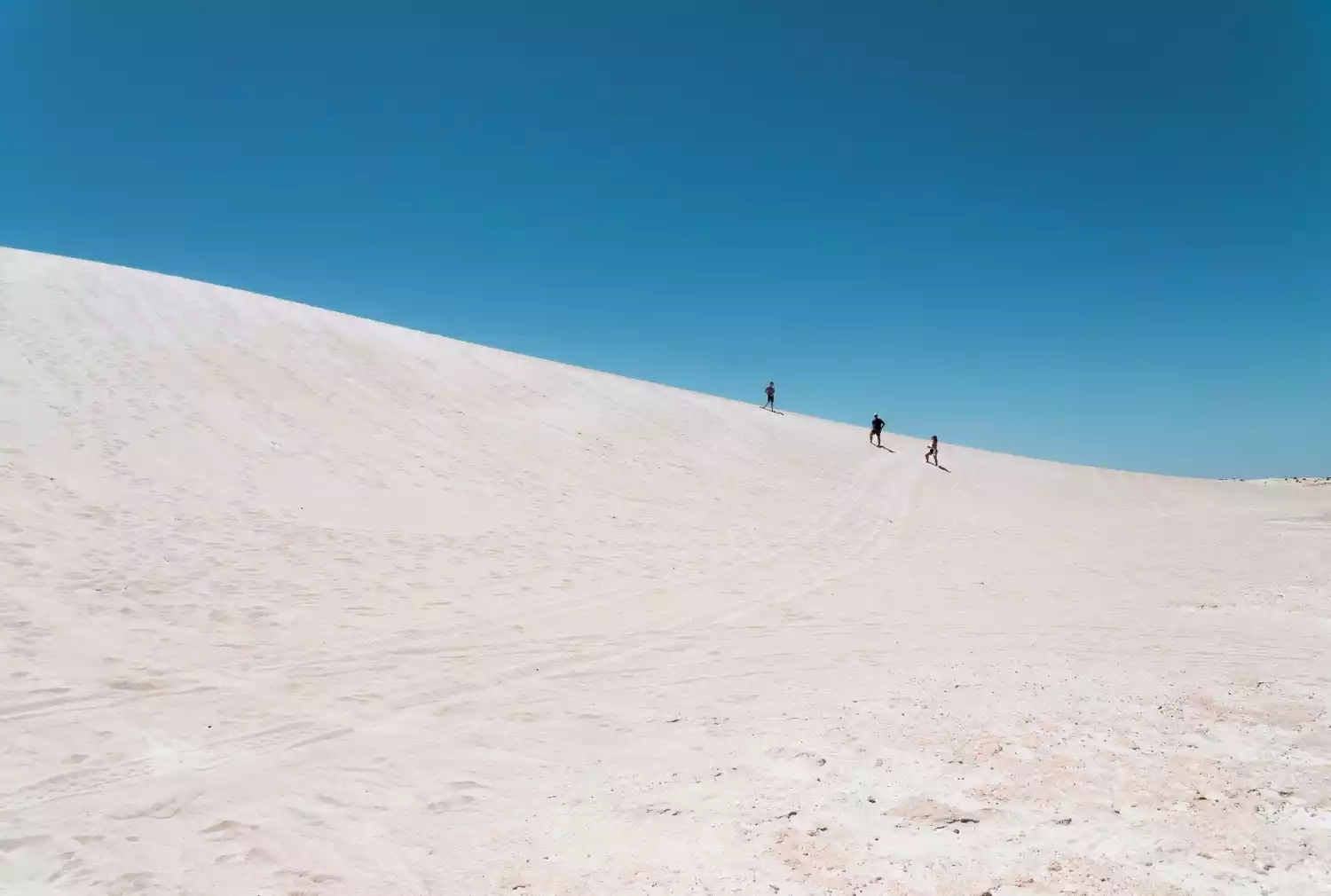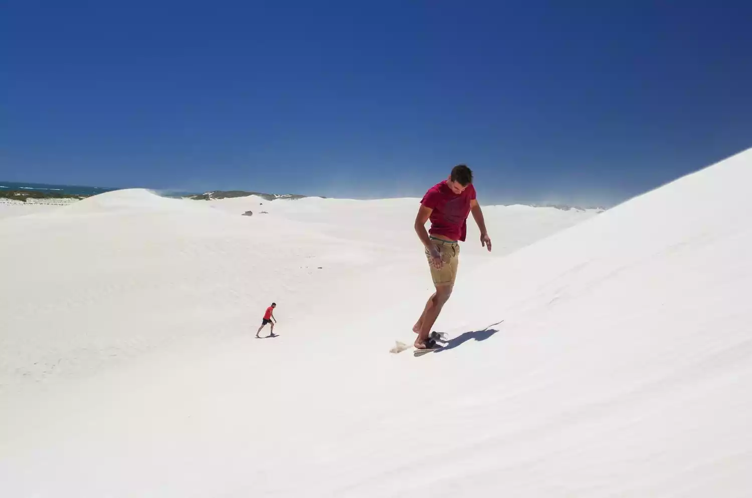 The Lanslin Sand Dunes are located approximately two hours north of Perth, the capital of Western Australia. Driving along this stretch of road, you'll encounter white sand dunes of varying sizes. The Lanslin Sand Dunes are among the largest and most accessible to the public. The Lanslin Sand Dunes offer a variety of desert-themed activities. After climbing to the top of the dunes, which slope nearly 60 degrees, you'll discover that the area is actually located on the coast, half sea and half desert. Sliding down the dunes on a sandboard is a thrilling and exciting activity, reminiscent of snowboarding in the tropics. To experience sandboarding, rent a sandboard and wax stick from a shop in the town of Lanslin, just before entering the dunes. Applying wax to the bottom of the board before sandboarding reduces friction and makes for a smoother slide.