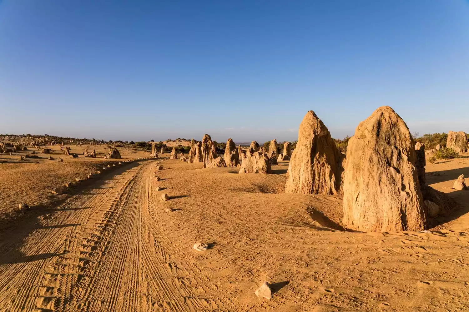 The Pinnacles, located in Nambung National Park north of Perth, are named for the numerous limestone pillars that stand tall in the flat desert. The Pinnacles area was once a primeval forest before sinking into the sea, where it was buried by sand and gravel, and over time, fossilized. After a long period of geological change, the area resurfaced as land. The effects of sunlight, rain, and wind gradually weathered and eroded the sand and gravel, creating the present geological wonder of countless stone pillars standing tall in the desert.