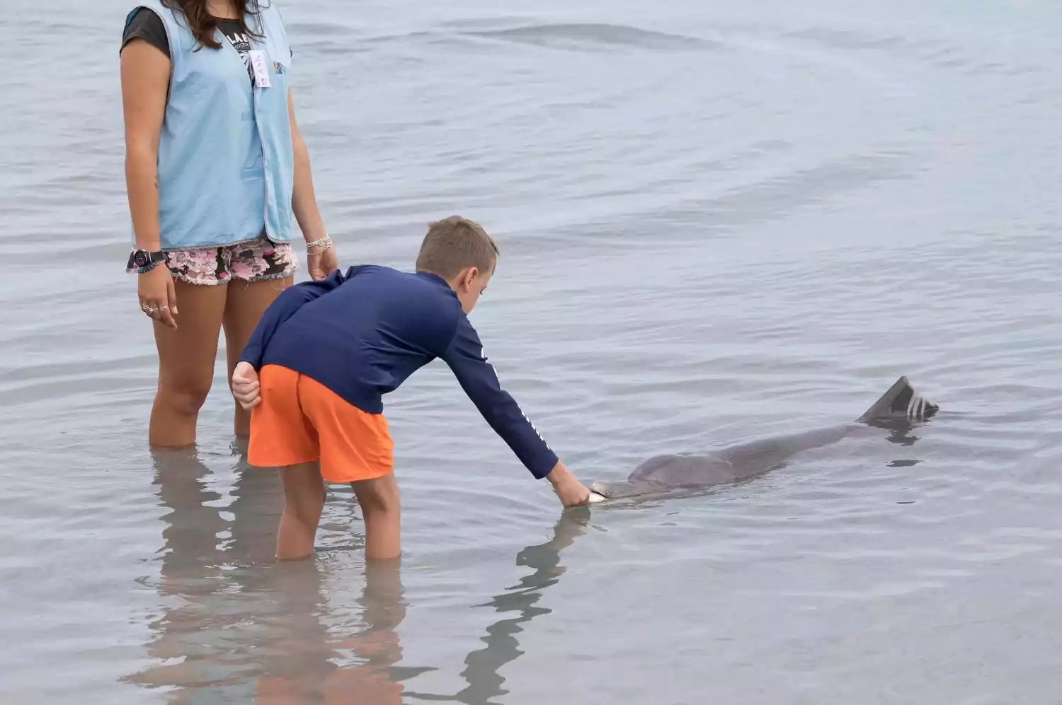 Shark Bay is located in the northern region of Western Australia, taking five to six hours to reach from Geraldton. Due to its remote location, it sees few tourists on weekdays, but it remains a beloved holiday destination for Australians. The entire Shark Bay area is a World Heritage Site, boasting stunning natural scenery and a vibrant wilderness experience. Monkey Mia is Shark Bay's most popular destination, primarily due to the dolphins that visit the beach at the Monkey Mia Resort every morning. The resort offers morning dolphin conservation presentations and selects guests to participate in the dolphin feeding experience, often with families, especially those with children. During the feeding, guests listen to explanations from the shore and can step into the shallows, knee-deep in the water, to interact with the dolphins.
