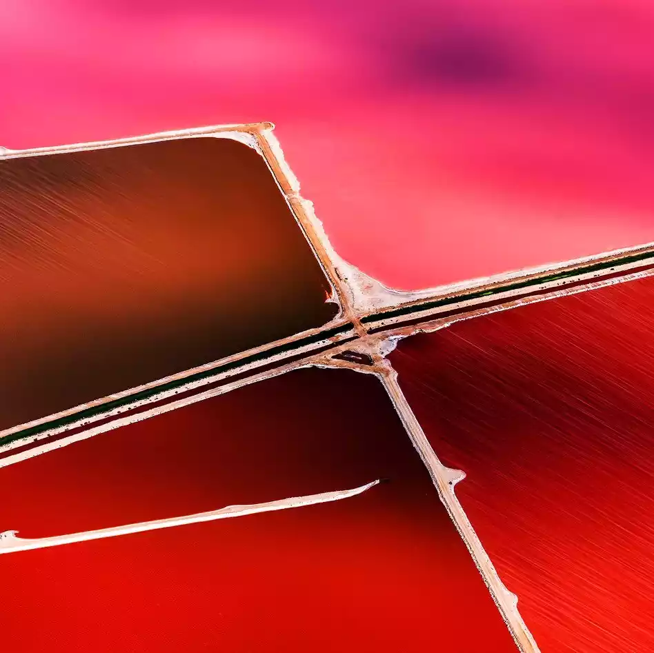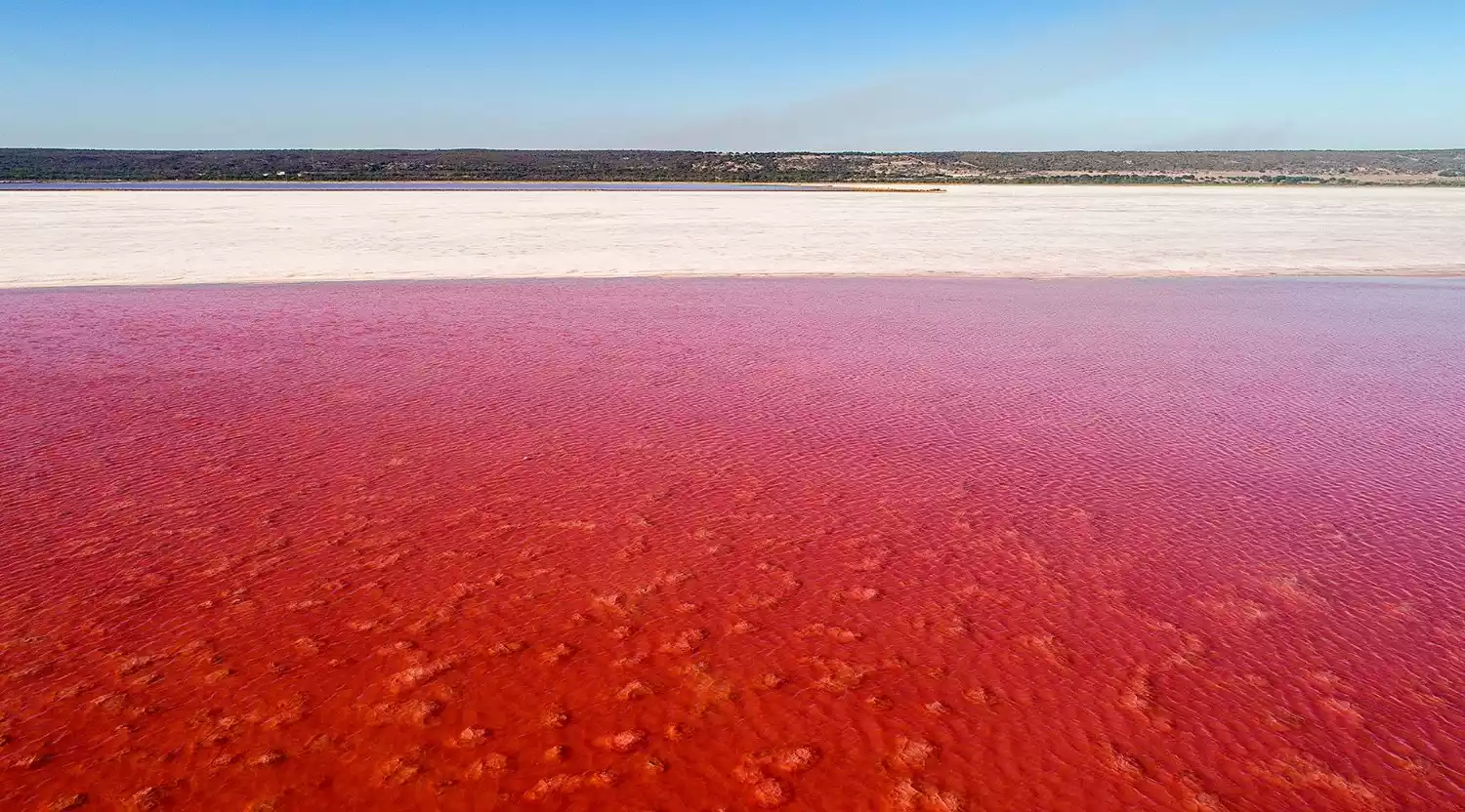 The Hutt Pink Salt Lake is Western Australia's biggest drawcard and calling card. Located about an hour's drive north of Geraldton, Western Australia's second-largest city, the lake's waters are pink year-round due to the lake's high salinity. The algae, Dunaliella salina, thrive in the waters under high salinity and sunlight, producing abundant beta-carotene. Near the lake's edge lies a saltworks, with numerous rectangular salt pans, whose color is even darker than the rest of the lake. Aerial drone photography of the salt pans is stunning.