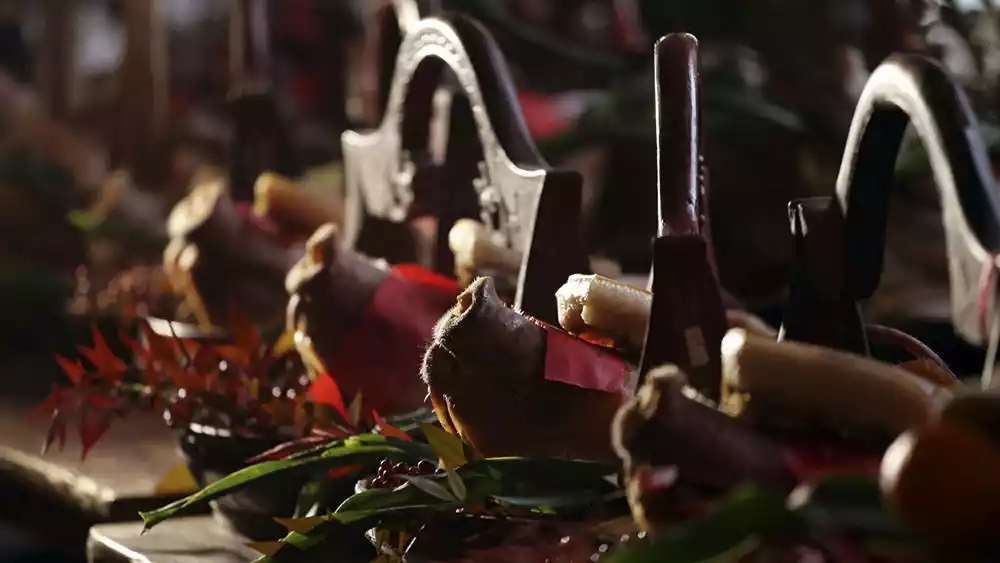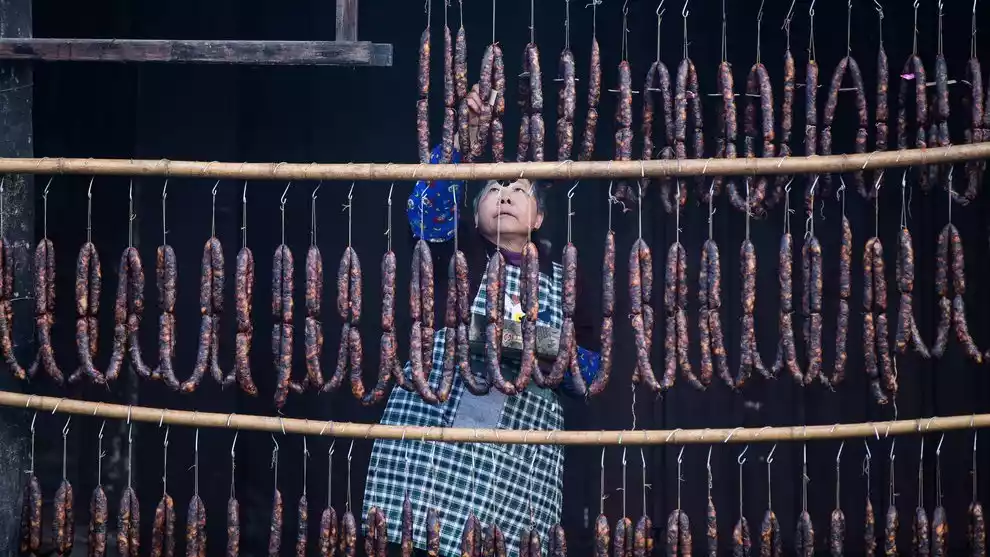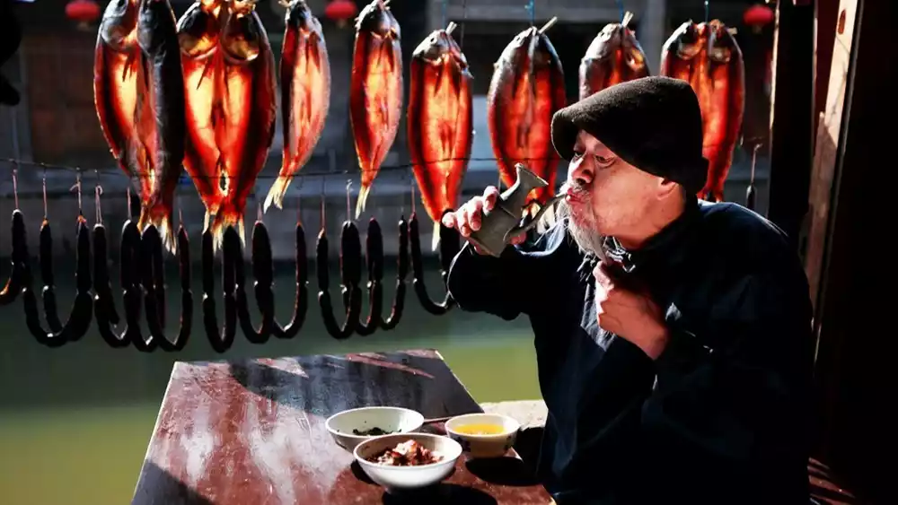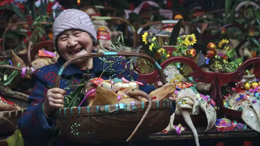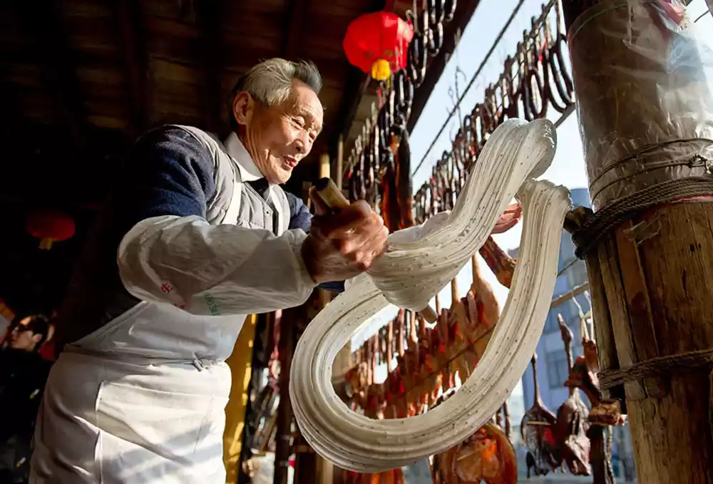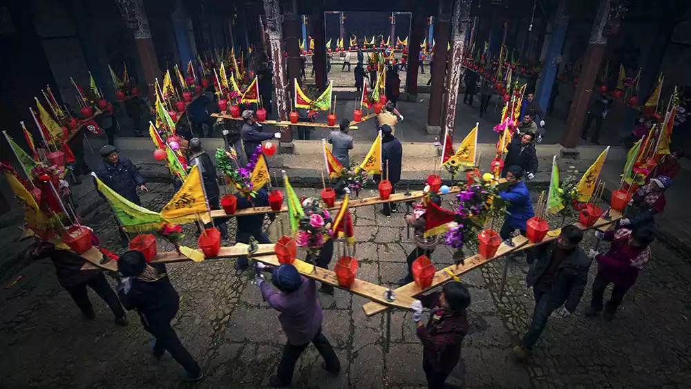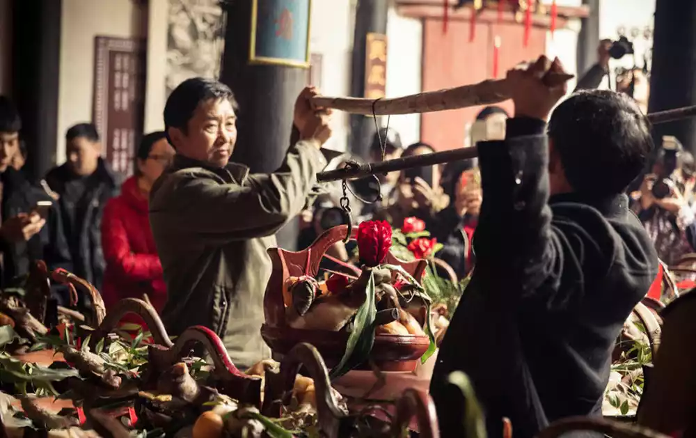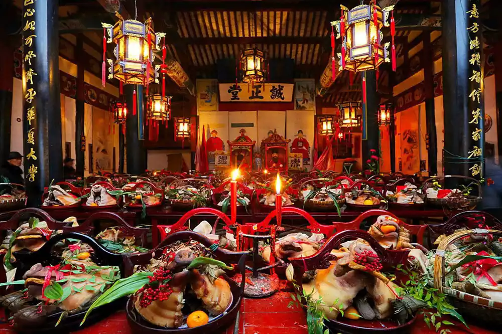 Every year at 3:00 a.m. on the sixth day of the first lunar month, the sound of gongs fills Zhujia Village. Household heads, carrying carefully decorated pig heads on trays, gather at the brightly lit Zhu Family Ancestral Hall and place them before portraits of their ancestors. They then burn incense, light candles, set off firecrackers, and bow in homage to their ancestors. Following the ceremony, a band plays traditional Chinese music, banging gongs and drums, creating a lively atmosphere. After breakfast, respected elders in the village evaluate the performance of each household's pig heads.