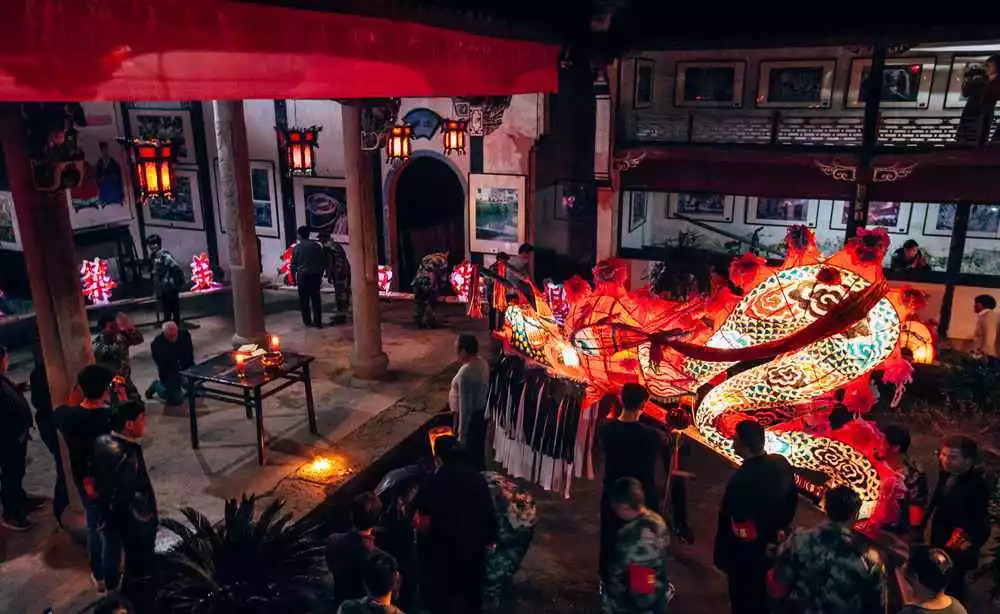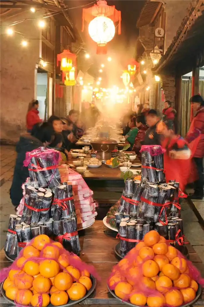 The family with the largest and best-decorated pig's head demonstrates their devotion to their ancestors, and the host rewards them with red envelopes and New Year pictures. After lunch, each family takes the pig's head to their ancestral grave for worship. They then take it home and place it horizontally in front of the main hall until the Lantern Festival. From the 13th to the 15th day of the first lunar month, the village celebrates with opera performances, bamboo horse dances, lion dances, and dragon lanterns, creating a lively atmosphere. The Zhujia Village "Pig Head Competition" has become a distinctive rural tourism attraction in Chun'an.