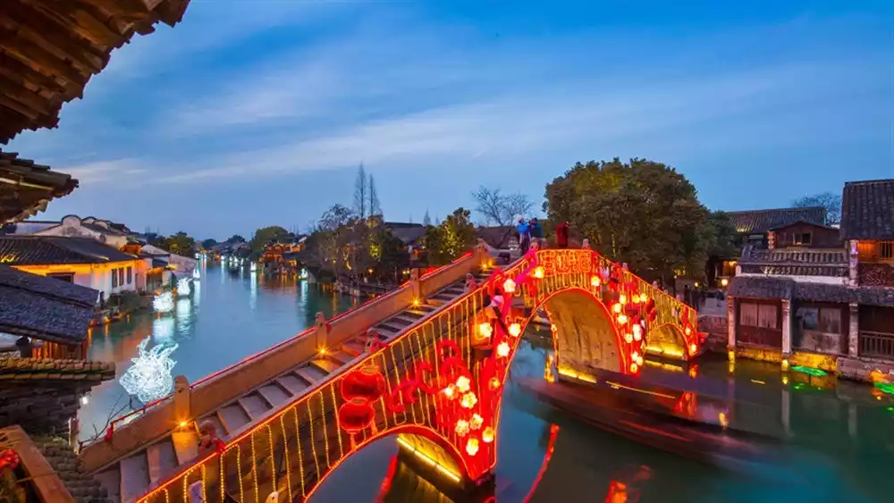 From the eve of the Chinese New Year to the Lantern Festival (January 28th - February 19th), seven groups of lively and playful large-scale lanterns with a total of more than 300 lanterns were carefully arranged in Yuanbao Lake, Andufang, Longxingtian and Yuelao Temple near the wooden plank road: Flying Together, Abundance Year After Year, Dragon Soaring in the Prosperous Era, Twelve Folk Customs of Wuzhen, Bajie Getting Married, Hundred Birds Paying Homage to the Phoenix and Dragons and Phoenixes Spreading the Sea. The lanterns are as their names suggest, lifelike, with a strong New Year atmosphere and graceful water village charm.