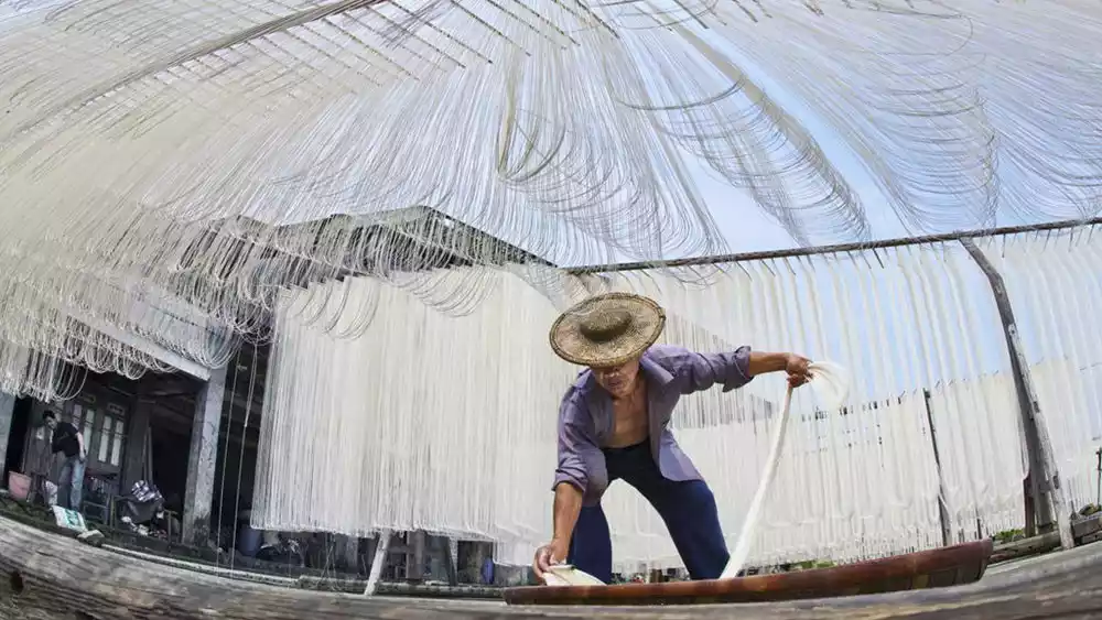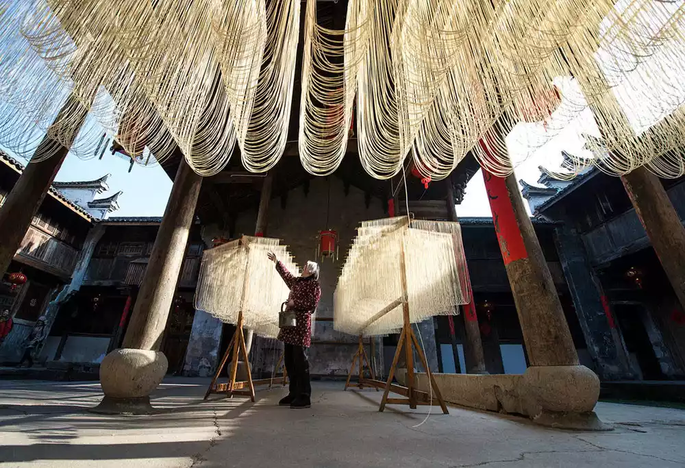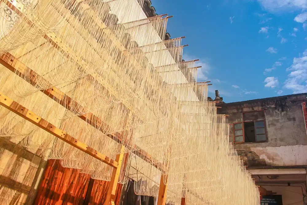 Every autumn and winter, Panzhoujia Village celebrates noodle season. When the weather is nice, the village's central square becomes a place where villagers prepare noodles. Strings of silky, thread-like noodles are lined up in rows. A single pound of flour can be stretched over a hundred meters, and the noodles are so resilient that they hold up even when used for skipping rope, creating a unique village scene.