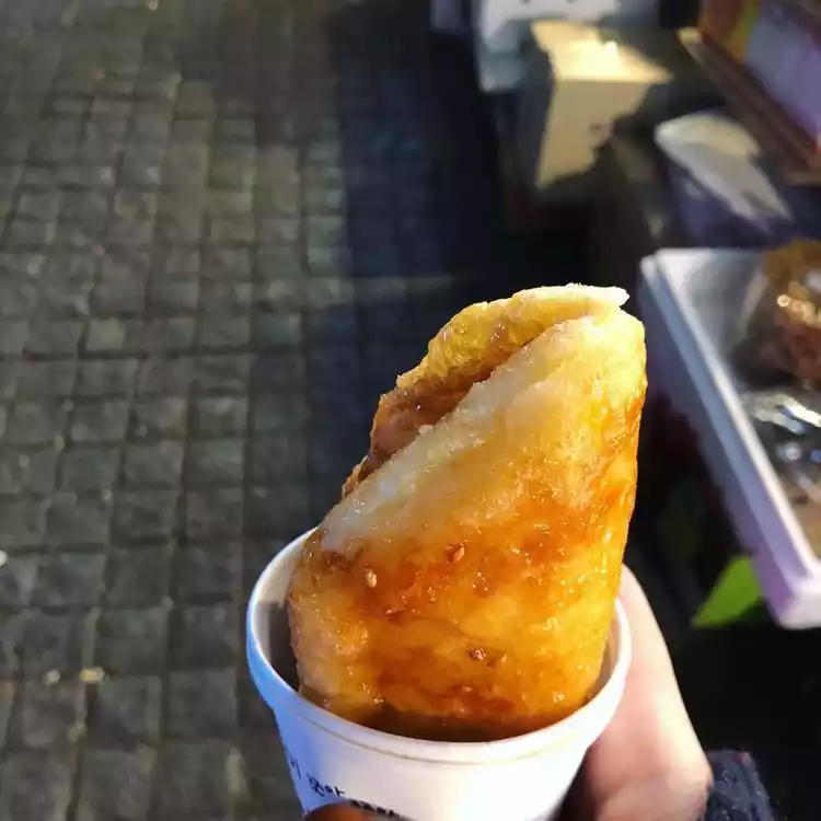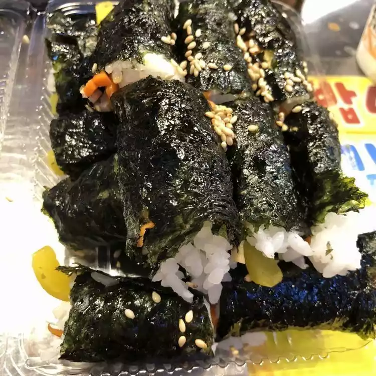 Translated from Korean, this is called sugar cake, which is actually the fried sugar cake we eat. Seaweed rice rolls, with some of the sauce prepared by my aunt, are delicious.