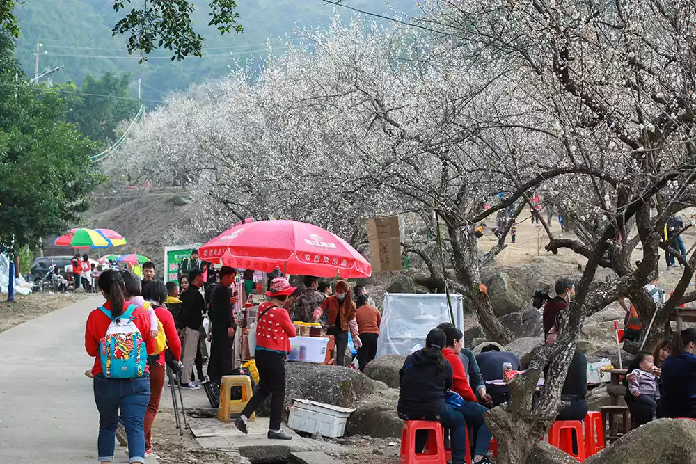 The area is covered in plum blossoms and produces a rich harvest of plums, which naturally leads to a wide variety of plum-related agricultural products. Along the Plum Garden Road, there are many small stalls set up by local villagers, where you can buy local specialty agricultural products after enjoying the plum blossoms.