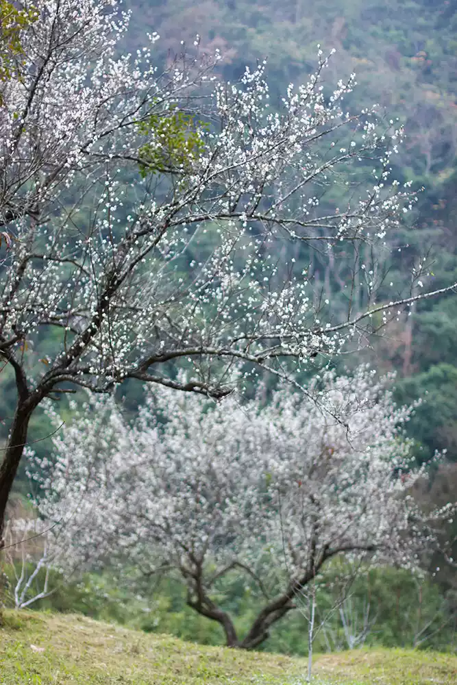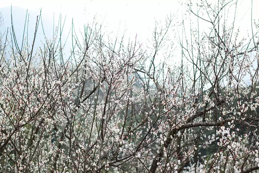 There are clusters of plum blossom trees along the mountain paths. Looking from across the mountains, they look like piles of snowflakes, which is a pleasant sight.