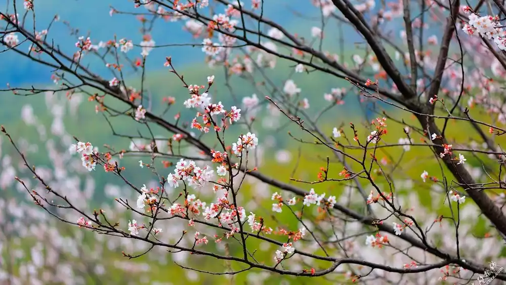 The wild cherry blossoms of Gexian Mountain, located in Guantangyi Town, Chibi City, grow on the top of a mountain that stretches 20 kilometers from Suiyang Mountain Area to Gexian Mountain. The wild cherry blossoms of various colors that appear sporadically on the mountain tops are like treasures, like clouds inlaid on the mountain tops and floating among the green bamboos.