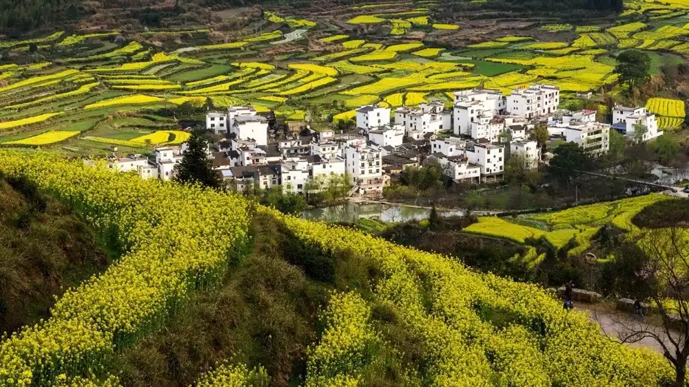 When it comes to rapeseed flowers, the first thing that comes to mind is Wuyuan. With the arrival of spring, rapeseed blossoms blanket the mountains, creating a stunning scene alongside the whitewashed, black-tiled, old houses. Wuyuan, known as "China's Most Beautiful Countryside," is a historic county in Jiangxi Province. In spring, when the rapeseed blossoms bloom in Wuyuan, stroll along the country's cobblestone paths, cross the stone arch bridges over the streams, and experience the comfort and warmth of these Hui-style farmhouses.