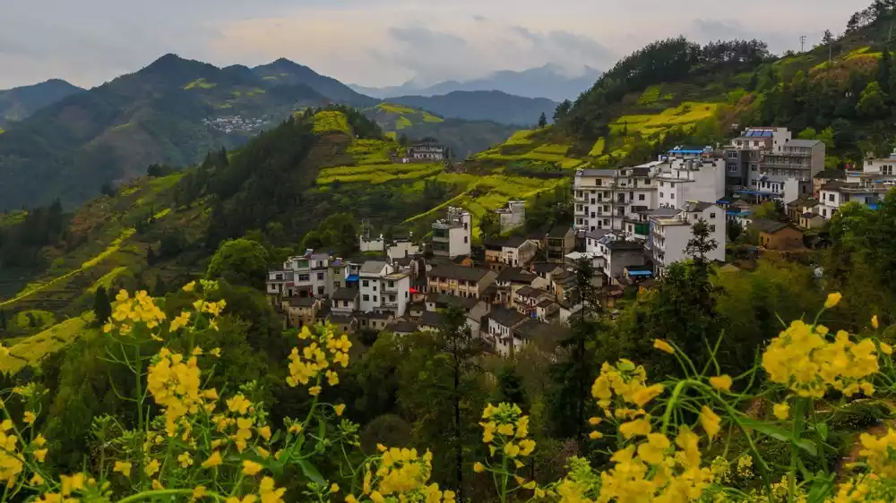 Rapeseed blossoms bloom early in Wuyuan's southwestern towns, around early March. Northeastern towns (such as Qinghua and Jiangwan Town) reach peak bloom from early March to early April. Areas like Jiangling and Qingyuan in Duanzi Township, due to the high altitude and cool water, will bloom a few days later than surrounding areas. By then, a profusion of golden rapeseed blossoms and tender pink peach blossoms, along with lesser-known wildflowers, Hui-style architecture, small bridges and flowing streams, and stone slabs and stone bridges, embellish the beauty of Wuyuan's spring. The beauty of Wuyuan's spring lies not only in the vibrant blossoms but also in the stunning blend of mountains, water, and villages.