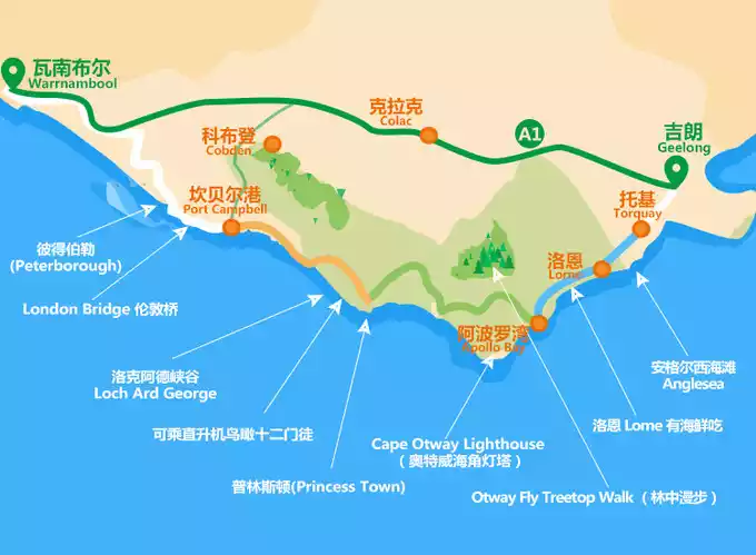 The second green route runs from Apollo Bay to Princeton, a total of approximately 80 kilometers. This section leaves the coastline and travels inland through the bush, passing through the Great Otway National Park. We are referring to the light green route below, not the dark green route above, which runs directly from the Great Ocean Road's starting point in Geelong to the highway at the end of the Great Ocean Road, Warrnambool. If you take this route, you won't even see the end of the Great Ocean Road.