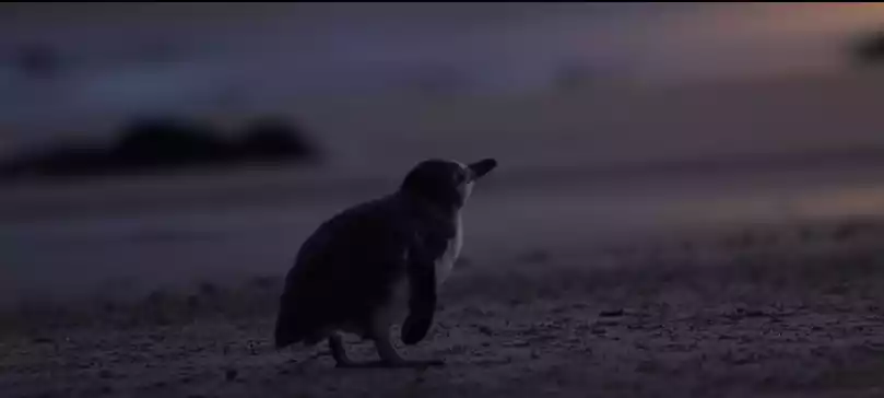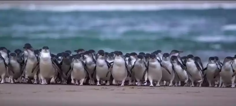 The penguins we see here are called Little Blue Penguins. Standing only 30 centimeters tall, they are the smallest penguin species in the world and are unique to Australia. Thousands of years ago, Little Blue Penguins began nesting in the sand dunes of Phillip Island. They leave early in the morning and return late at night, leaving Phillip Island during the day to forage in the deep sea, one to two hundred kilometers offshore. Every evening, after sunset, a group of Little Blue Penguins return to their nests along a fixed route, carrying food to feed their chicks. No matter when they leave during the day, they always return at the same time every night.