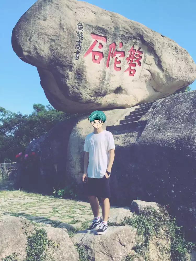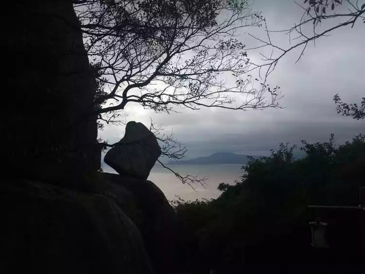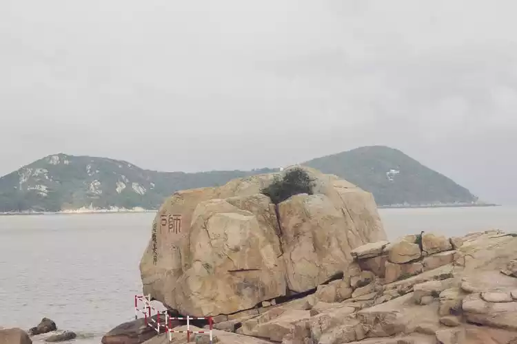 On the beach, there's a huge rock shaped like a stone lion, inscribed with the words "Stone Master," meaning it withstands wind and waves, possesses a steadfast will, and is a worthy teacher. Walking along the beach, you can even see the Nanhai Guanyin statue in the distance.
