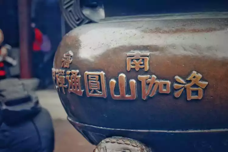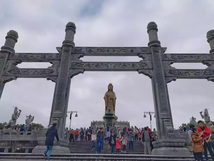 The Nanhai Guanyin statue on Mount Putuo is a very tall standing statue, with three floors and a total height of 33 meters. The Buddha statue is 18 meters high, with Amitabha on the top of the neck, holding the Dharma wheel in his left hand and making the fearlessness seal with his right hand.