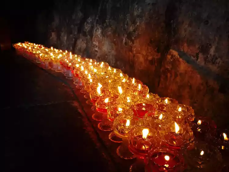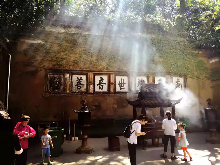 After passing the Ergui Tinghai Stone, continue down the mountain to reach the Guanyin Ancient Cave. Inside the cave, a stone pillar hangs down to the ground. Images of Guanyin are carved above and around the cave. Incense burns year-round, attracting a constant stream of pilgrims.