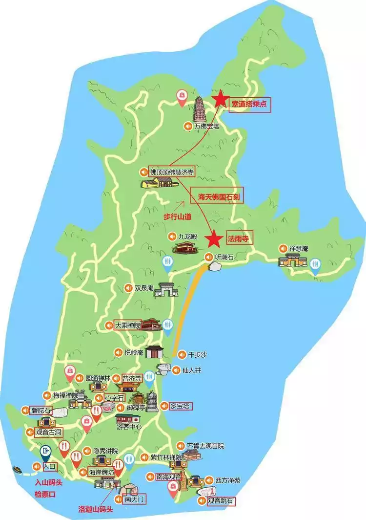 Pier - Walk - Duangu Daotou - Walk - Nantianmen - Walk via the beach - Nanhai Guanyin - Bus (You can take the cable car up the mountain or walk up the mountain road next to Fayu Temple) - Jichan Temple - It is recommended to walk down the mountain - Fayu Temple - Bus - Puji Temple - Walk - Xitian Scenic Area - Walk - Pier.