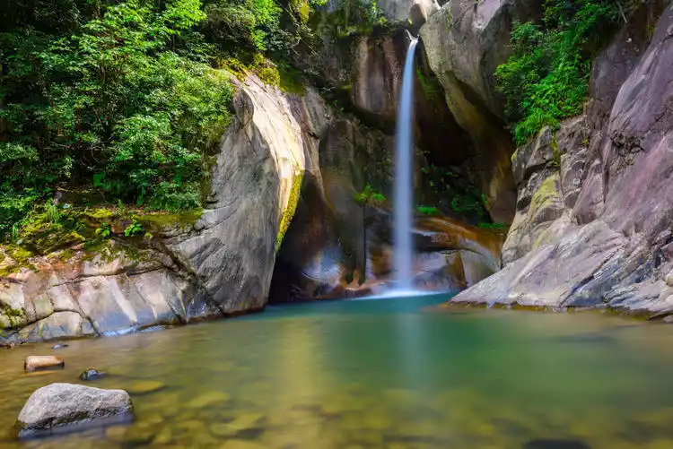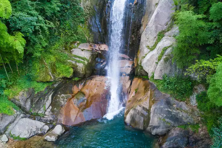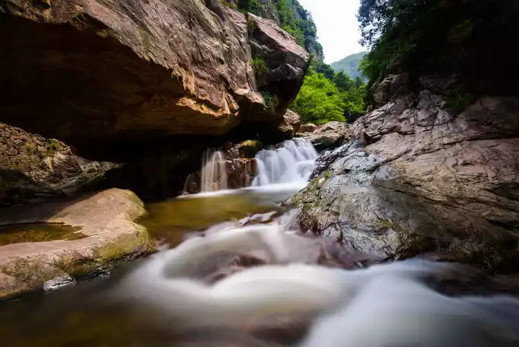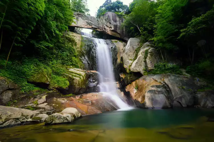 The most stunning sight in the scenic area is the Shiliang Waterfall. Walking to the edge of the pool, you can take a closer look at the waterfall. The natural stone beam spans the col between two mountains, nearly two meters wide and ten meters long. The water flows down the top of the waterfall like a white silk thread, then hits the rocks at the cliff mouth, turning into dense drops of water.