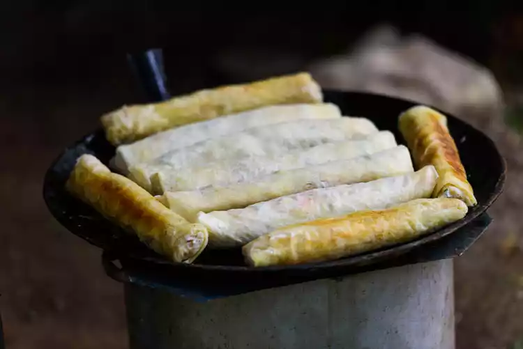 If you're in the county town, you can try Tiantai Mountain snacks. Recommendations include: dumpling rolls, Tiantai flatbread, five-flavor porridge, and Hu La Tai.