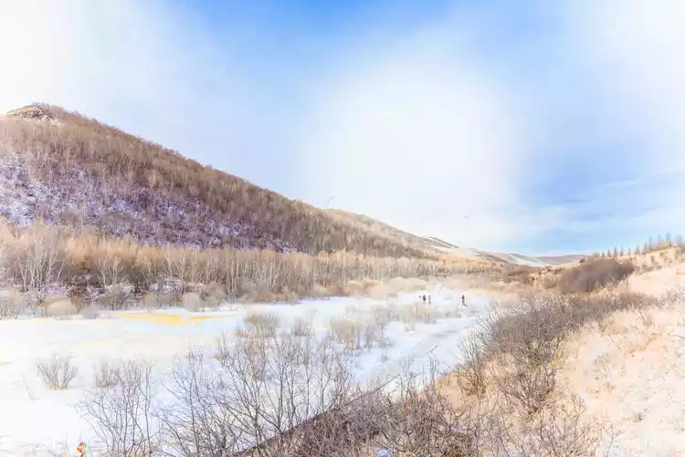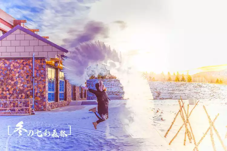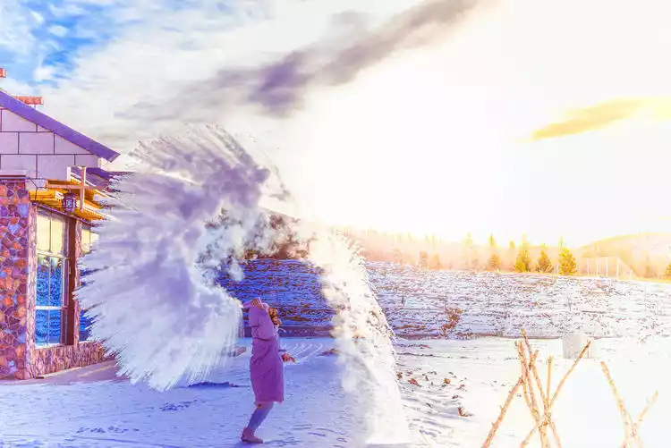 The colorful forest in the early morning was a bit chilly, and the wind blew off the distant mountains, revealing the vast expanse of the land. A day's plan begins in the morning, and a beautiful day begins now. I ordered hot water from the hotel and, facing the rising sun, experienced the process of pouring water into ice at the entrance. Shivering in the 20-degree below zero temperature, I bounced and danced, creating the most beautiful and heartwarming moment in the sunlight.