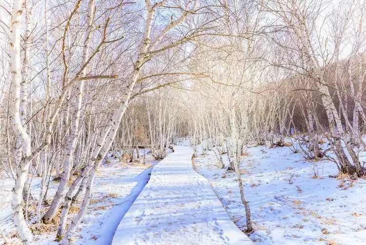 The wooden plank road weaves through the jungle, passing Tianjing Lake, a small artificial viewing lake. However, the lake is now completely covered with ice and snow, and the boundary between it and the land is unclear.