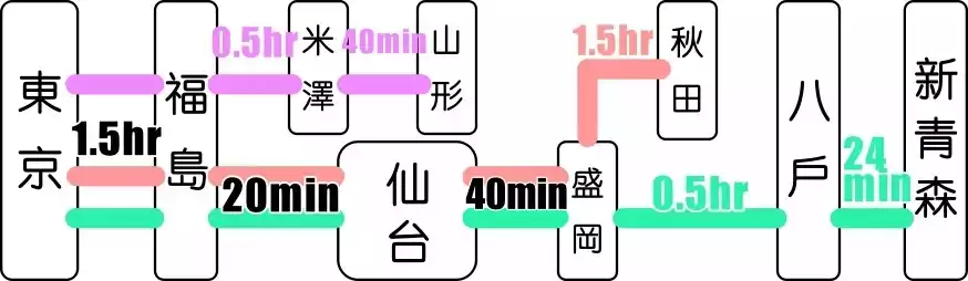 The image below shows Shinkansen connections and travel times. (Purple is the Yamagata Shinkansen, pink is the Akita Shinkansen, and green is the Tohoku Shinkansen.) As you can see, if you make good use of this all-you-can-ride Shinkansen pass, you can travel between almost all the major cities in Tohoku in a single day!