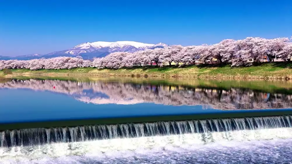 Ninety years ago, cherry blossom trees were planted along the Shiroishi River embankment for eight kilometers. Today, these trees, backed by snow-capped mountains and accompanied by the flow of the Shiroishi River, form an exceptionally spectacular cherry blossom tunnel that is truly breathtaking.
