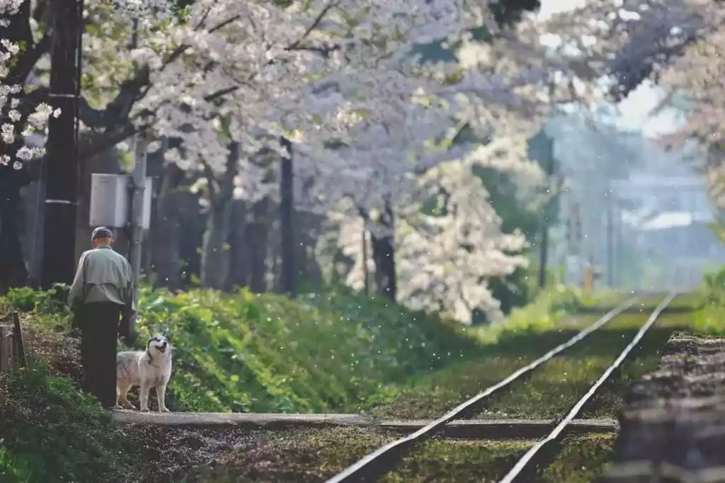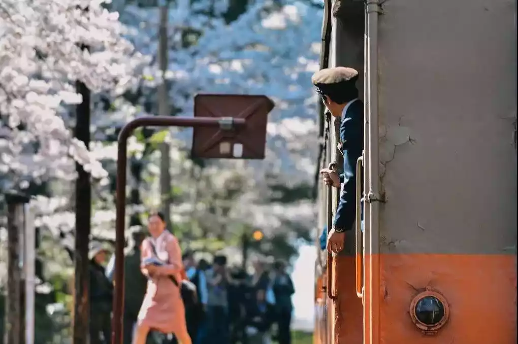 We arrived at dawn by train, the mist still thick as we entered the cherry blossom forest. Soft, scattered sunlight filtered through the branches and leaves, tinging the fresh green foliage with a faint golden glow, like something straight out of a cartoon. As the train passed, blossoming branches gently caressed the train body, softening the hard iron, suffusing it with the fragrance of cherry blossoms. The people passing by also became even more gentle and charming.