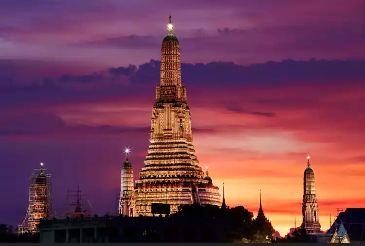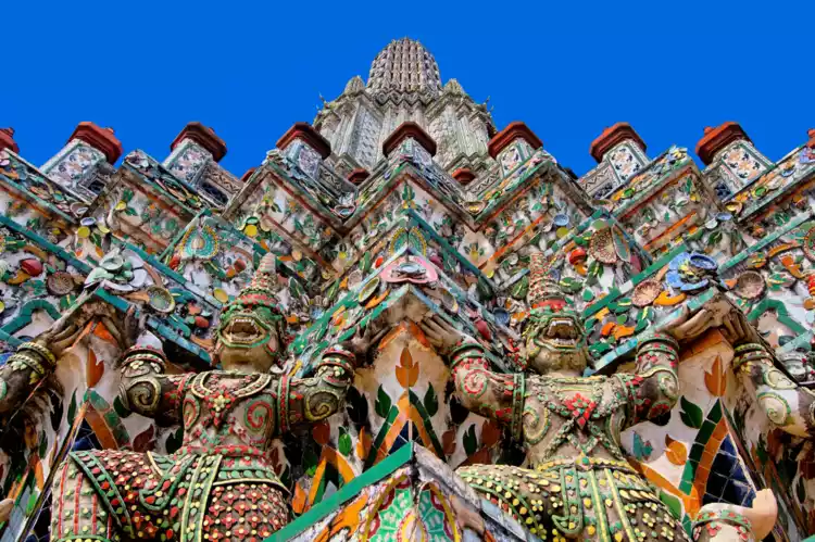 Wat Arun, also known as the Temple of Dawn, is second only to Bangkok's Grand Palace in size. Standing on the west bank of the Chao Phraya River, it contrasts beautifully with the Grand Palace. Its pagoda is entirely white and boasts intricate decorations, inlaid with various colored ceramic pieces, glass, and shells.