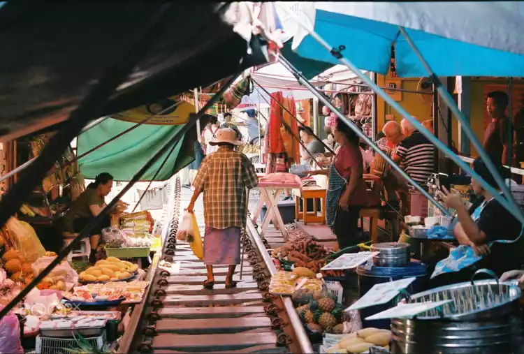 Here, vendors set up retractable umbrellas and plastic tents to shield themselves from the sun and rain, some even extending over the tracks. Tourists milled about, some snapping photos, others vying for the best vantage point to watch the approaching train. A whistle pierced the air, and the magic began. The vendors quickly folded their umbrellas and plastic tents, some lifting their wares from the tracks. As the train glided past, everyone scattered, almost brushing past. For first-timers, this experience might be a bit daunting. But after the train passed, everything returned to normal, as if nothing had happened. This magical scene has made it a renowned destination for Thai street life.