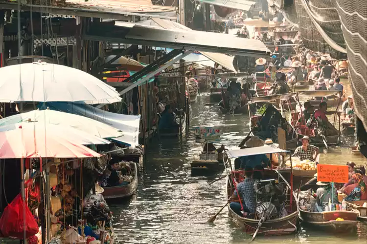 At the market, small boats crisscrossing the canals, along with the waterside houses lining the banks, create a quintessential Bangkok impression. Along the canals, lined with lush tropical trees, elderly women in straw hats row small boats loaded with fruits and vegetables through the narrow waterways, their cries echoing through the waterways, creating a unique and charming atmosphere.