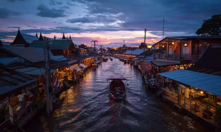 The hum of longtail boats drifting down the canal, the stilt houses of locals lining the canal passing by, a thrill you can only experience here. Damnoen Saduak Floating Market is one of Bangkok's most famous markets, attracting many tourists who spend hours wandering among the crowds, trying to immerse themselves in the country's culture and the daily lives of ordinary people.