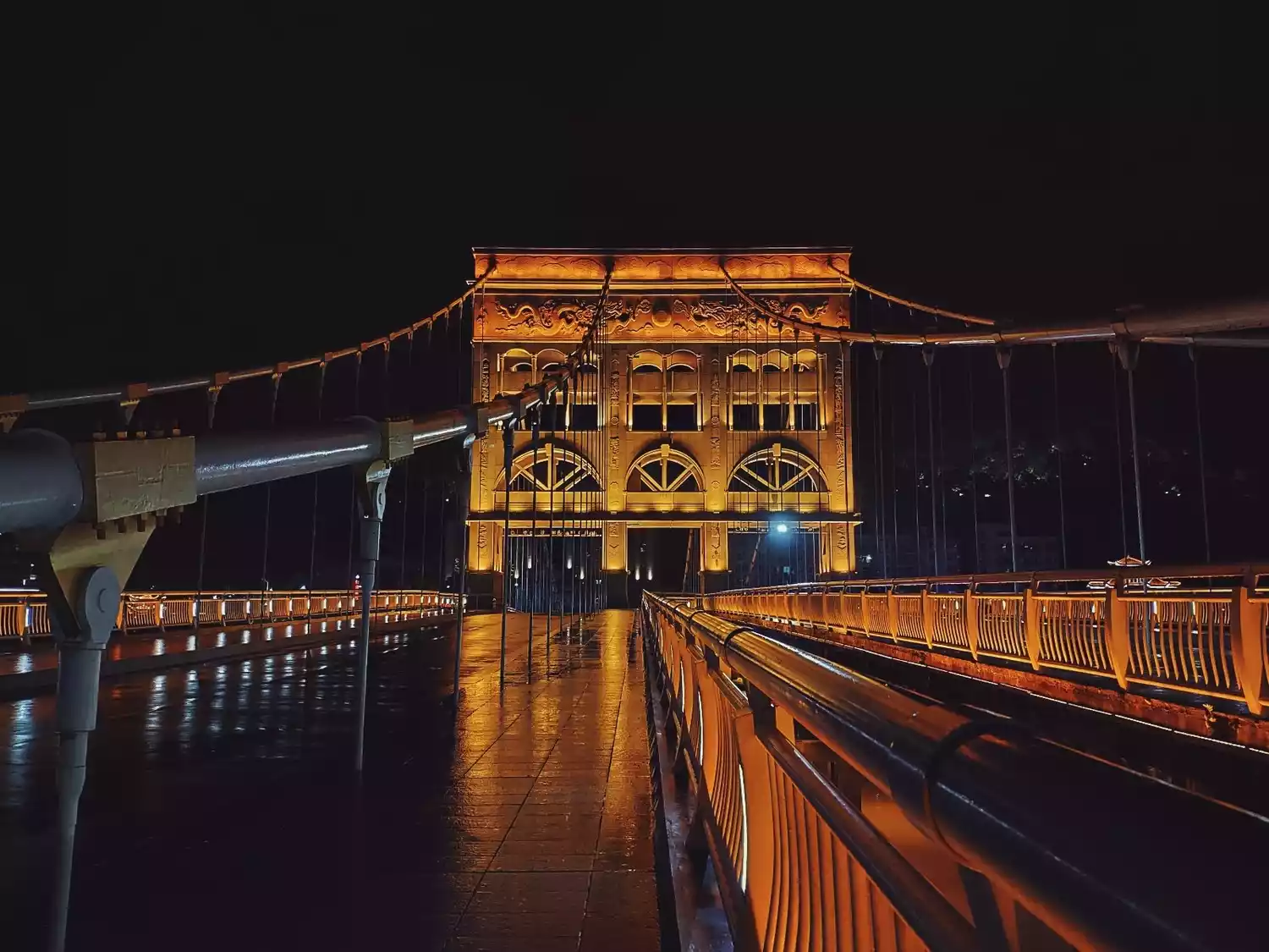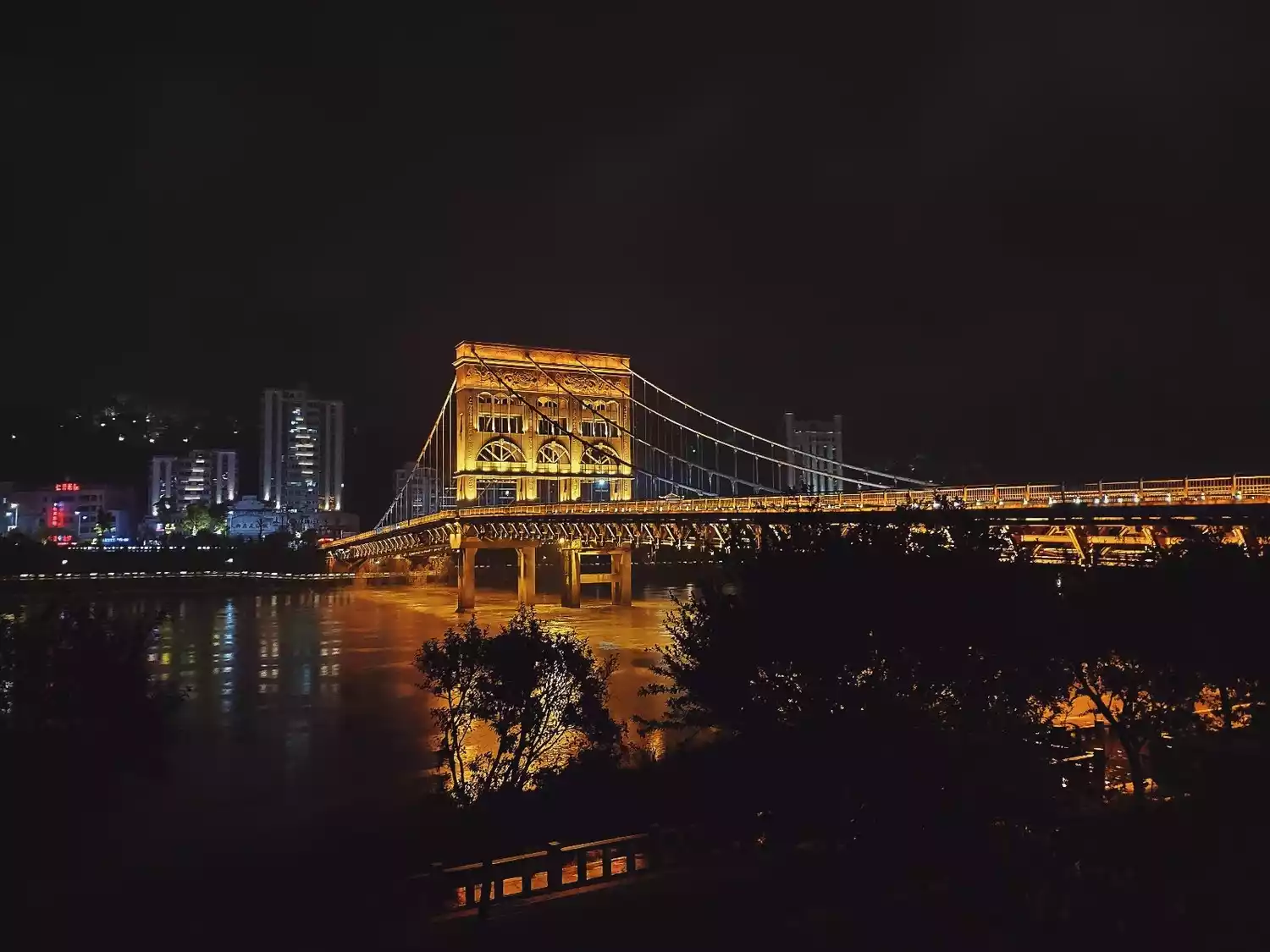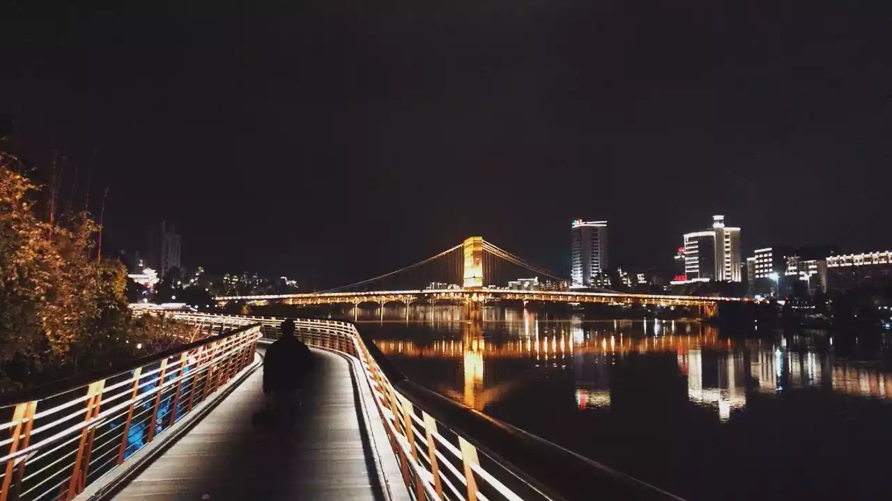As night falls and the lights come on, it's the perfect time to take photos of the cable bridge. The bridge becomes completely different once the lights are on, creating a unique and charming scene against the backdrop of the night.