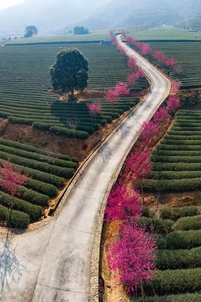 Not far from the cherry blossom garden, there is a thousand-acre tea field. The cherry blossom path hidden in the vast tea field has a unique charm.